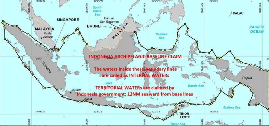 Tuyên bố đường cơ sở và vùng nước nội thủy của Indonesia. Nếu tàu không nắm rõ thông tin này sẽ tiềm ẩn nguy cơ cao bị biên phòng Indonesia bắt do neo hoặc có các hoạt động không khai báo theo qui định của họ.