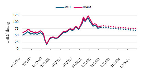 Giá dầu thô đã giảm đáng kể so với mức giá cao nhất trong năm 2022 và EIA dự đoán rằng giá dầu thô sẽ tiếp tục trượt dốc. Giá dầu Brent biển Bắc trung bình dự kiến sẽ đứng ở mức 84 USD/thùng vào năm 2023 và 78 USD/thùng vào năm 2024, giảm từ mức trung bình 101 USD/thùng trong năm 2022. Điều này sẽ góp phần hỗ trợ cho sự gia tăng về nhu cầu.
