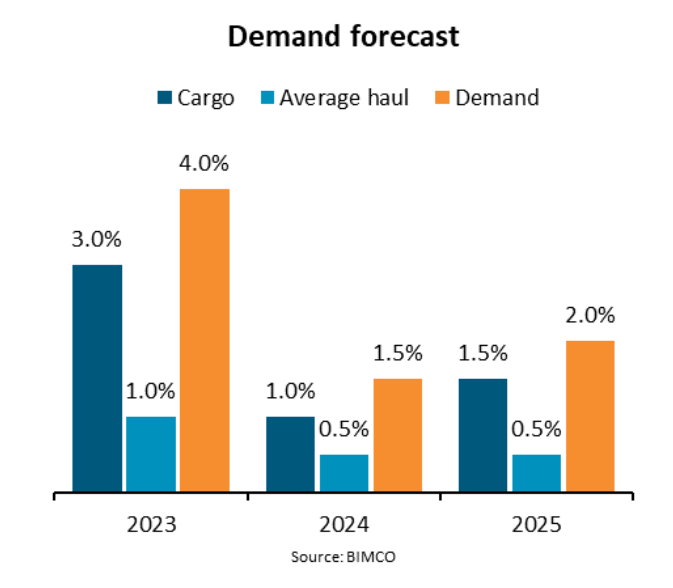 Trong kịch bản ở điều kiện bình thường của mình, Bimco dự kiến nhu cầu vận chuyển tăng 2,5-3,5% năm 2023; 0,5-1,5% năm 2024 và 1-2% năm 2025.