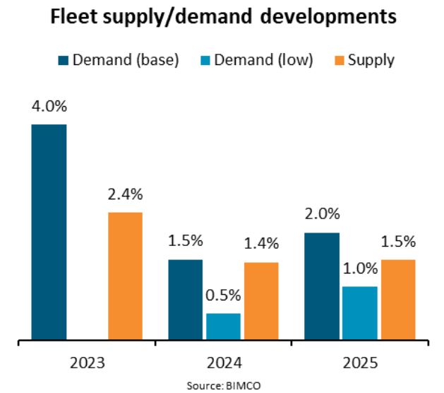 Bimco dự báo nếu các điều kiện kinh tế xấu hơn dẫn đến kịch bản nhu cầu vận chuyển giảm thấp, cung tàu sẽ vượt quá nhu cầu vận chuyển trong năm 2024 và 2025. Theo kịch bản đó, sẽ có thêm nhiều tàu được phá dỡ và tốc độ tàu sẽ được giảm thêm