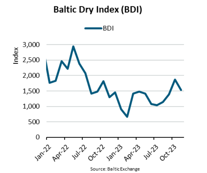 Chỉ số BDI duy trì ở mức thấp trong hầu hết cả năm 2023, đặc biệt trong những tháng mùa hè. Tuy nhiên, chỉ số đã được cải thiện từ tháng 9, dẫn dắt bởi giá cước cao ở các hợp đồng thuê chuyến tàu cỡ capesize. Nhìn chung trong năm nay, phân khúc capesize tương đối tốt hơn so với các tàu cỡ nhỏ hơn, do được hưởng lợi từ nhu cầu mạnh mẽ về quặng sắt, than và bauxite.